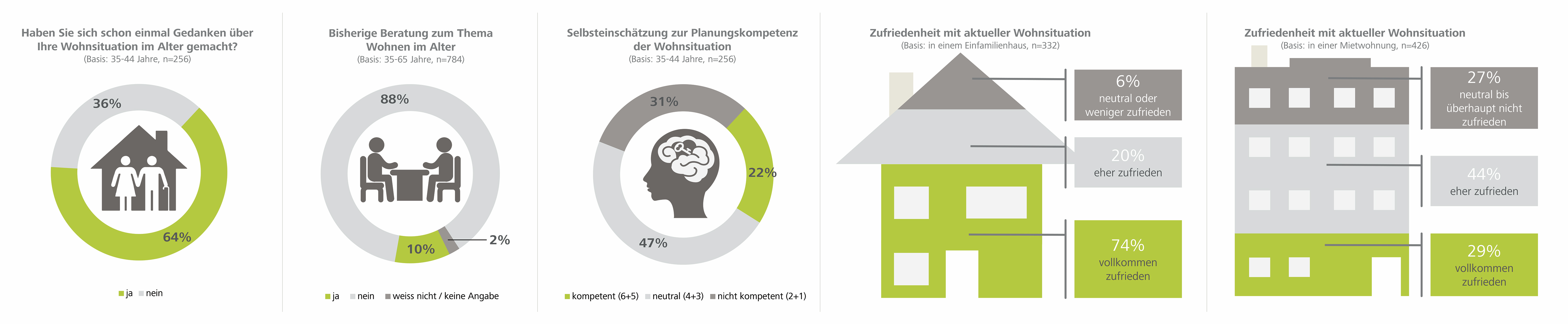Befragt zur aktuellen Wohnsituation sind Menschen mit Eigenheim durch alle Altersgruppen hindurch zufriedener als Leute in Miete. Was aber auffällt ist, dass sich die Zufriedenheit bei den Mietenden mit zunehmendem Alter markant positiv verändert: von über 60% im Alter von 35 bis 44 Jahren bis knapp 90% bei den Personen zwischen 65 und 75 Jahren. Der Grossteil der älteren Menschen bis 75 Jahre braucht gemäss eigener Einschätzung praktisch keine Unterstützung im Alltag (putzen, einkaufen, körperliche Hygiene etc.). Wer dennoch Hilfe benötigt, zieht in der Regel Familienangehörige bei.